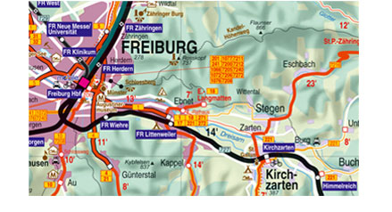 Neuartige kartografische Darstellung des Öffentlichen Verkehrs (ÖV), geordnet nach Verkehrsträger, Qualität und Fahrhäufigkeit. Ausschnitt aus der VCD-Fahrplankarte "Südlicher Oberrhein",